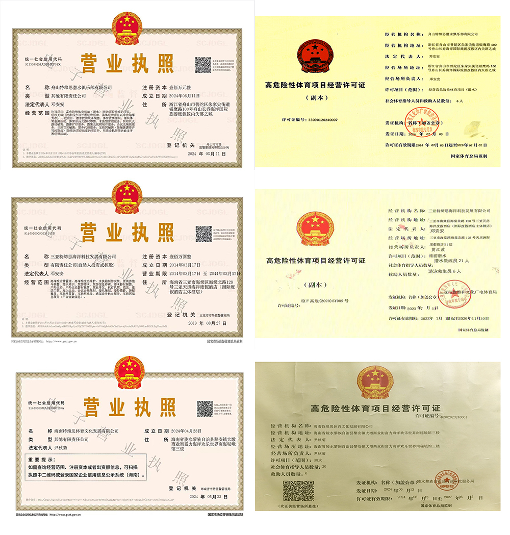 公司成立于2008年8月(原:三亞北緯十八度潛水俱樂部有限公司),下設(shè)三亞特締思海洋科技發(fā)展有限公司、舟山特締思潛水俱樂部有限公司、海南特締思體育文化發(fā)展有限公司。公司是中國潛水運動協(xié)會的注冊會員,也是PADI、CMAS等潛水組織授權(quán)的潛水培訓(xùn)辦證機構(gòu)。公司目前主要負責(zé)三亞海棠灣天房洲際度假酒店海洋館、舟山長喬海洋公園、海南陵水富力海洋世界等場館的潛水運營管理。